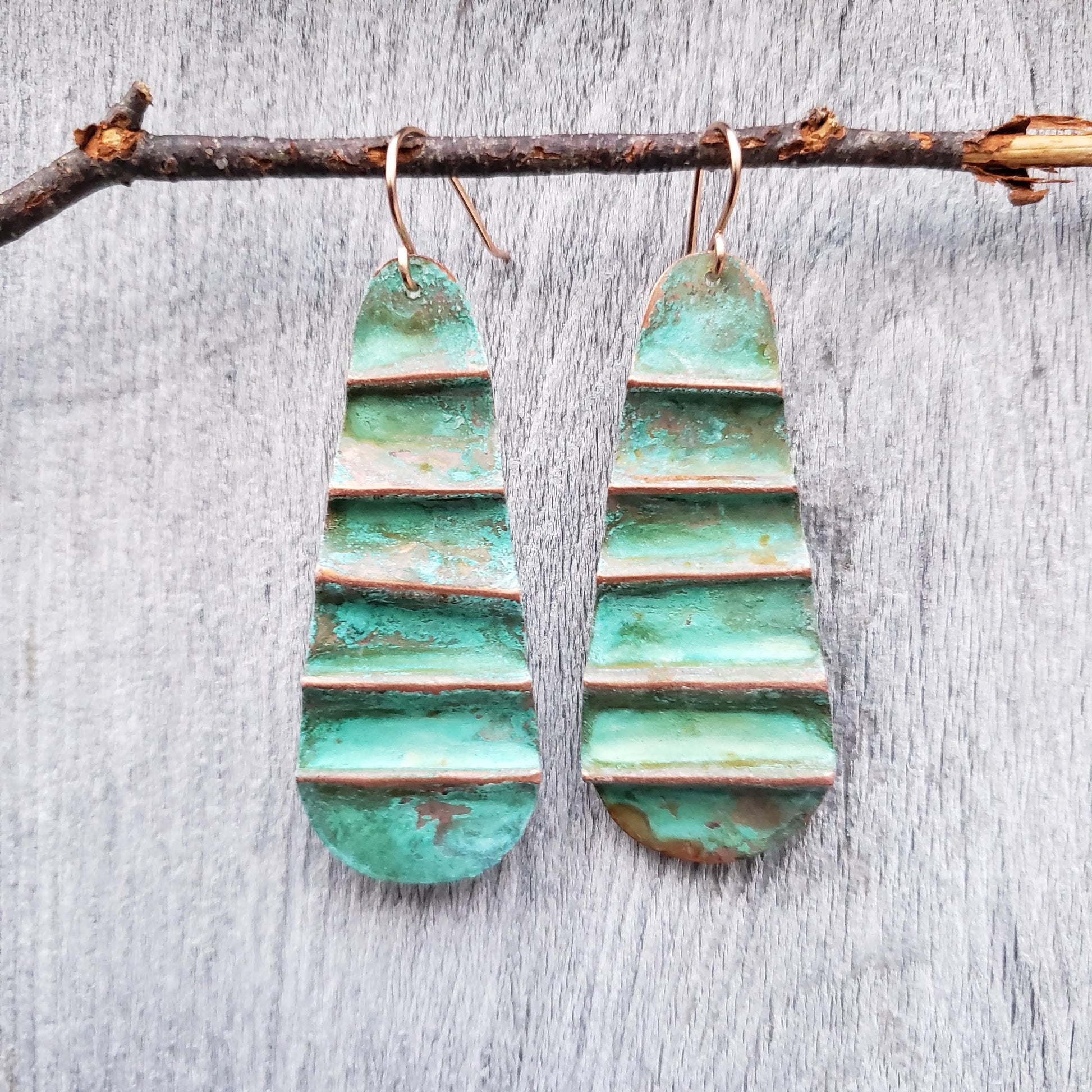 These handcrafted Ocean Treasure copper earrings feature eye-catching texture, sterling silver ear wires, and a glazed finish to stabilize the oxidation They come in a variety of shapes and sizes. Each pair is unique. These are examples of the styles. At any given time I may variations of the items photographed. Please contact me at crystalborealisstudio@gmail.com