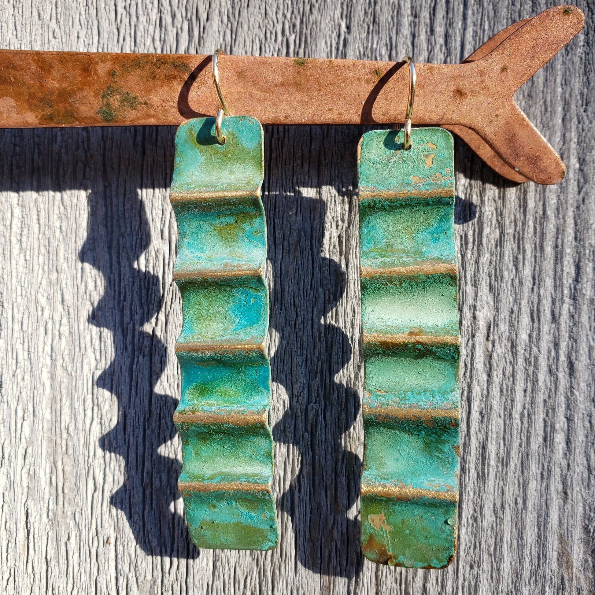 Dive into ocean-inspired style with these handcrafted Ocean Treasure earrings. Each pair features textured brass with a striking green patina and glazed finish that locks in the oxidation for lasting character. Sterling silver ear wires ensure comfort. The warm golden undertones of brass pair beautifully with gold jewelry, making them endlessly versatile. Since every pair is individually crafted, yours will be completely one-of-a-kind. Styles and sizes vary—contact crystalborealisstudio@gmail.com to explore current options and find your perfect match.