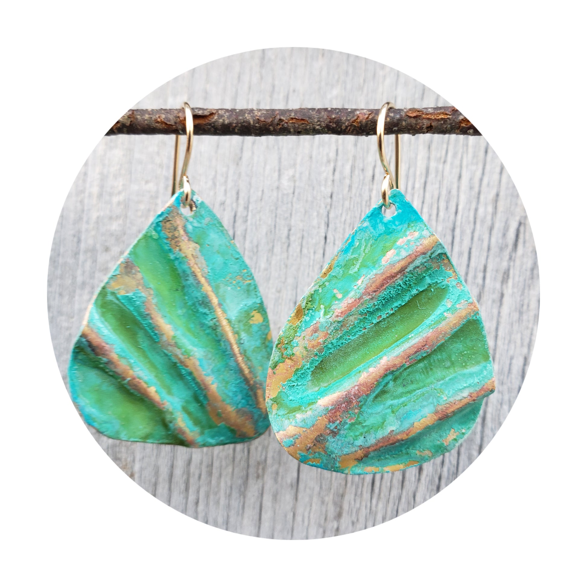 Dive into ocean-inspired style with these handcrafted Ocean Treasure earrings. Each pair features textured brass with a striking green patina and glazed finish that locks in the oxidation for lasting character. Sterling silver ear wires ensure comfort. The warm golden undertones of brass pair beautifully with gold jewelry, making them endlessly versatile. Since every pair is individually crafted, yours will be completely one-of-a-kind. Styles and sizes vary—contact crystalborealisstudio@gmail.com to explore current options and find your perfect match.