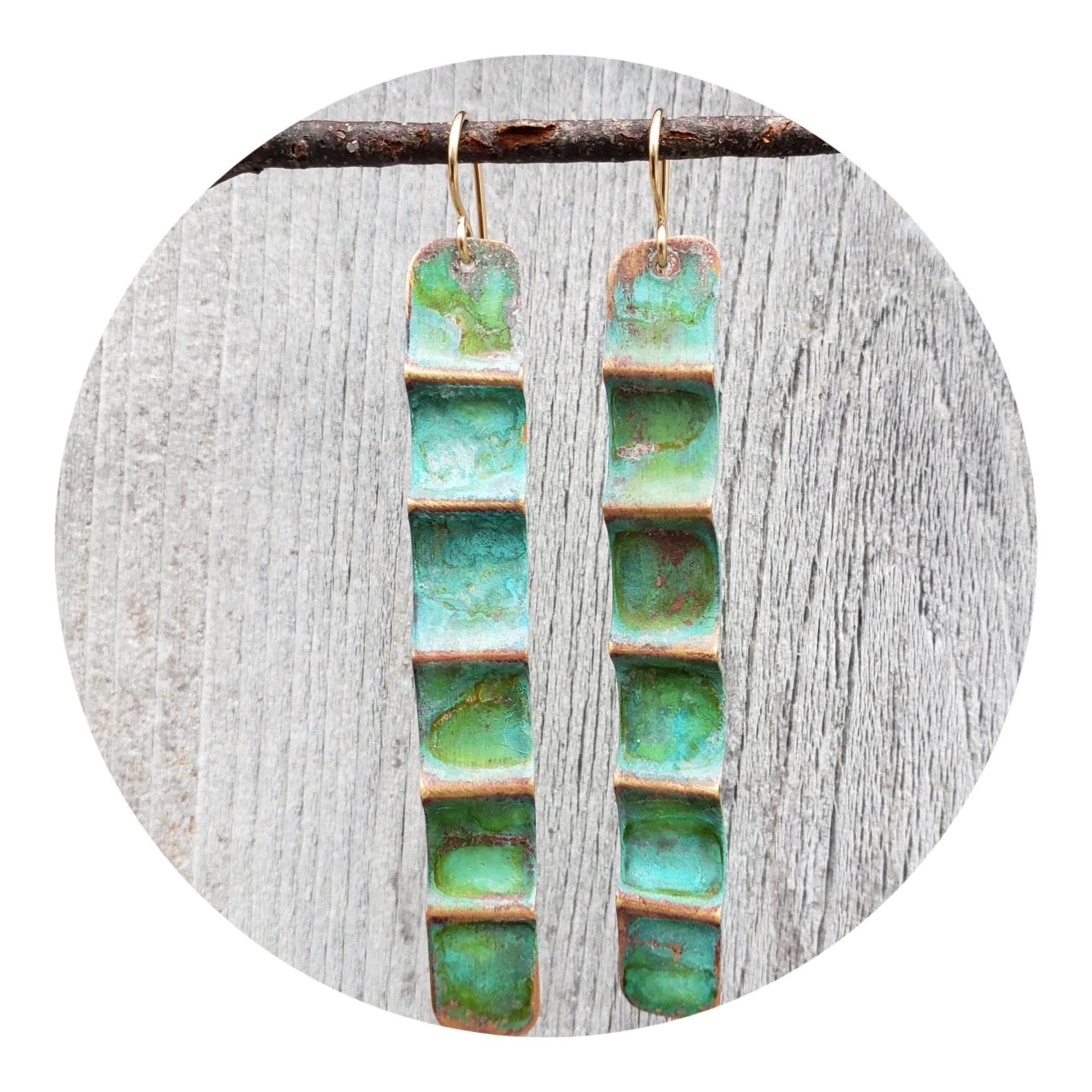 Dive into ocean-inspired style with these handcrafted Ocean Treasure earrings. Each pair features textured brass with a striking green patina and glazed finish that locks in the oxidation for lasting character. Sterling silver ear wires ensure comfort. The warm golden undertones of brass pair beautifully with gold jewelry, making them endlessly versatile. Since every pair is individually crafted, yours will be completely one-of-a-kind. Styles and sizes vary—contact crystalborealisstudio@gmail.com to explore current options and find your perfect match.