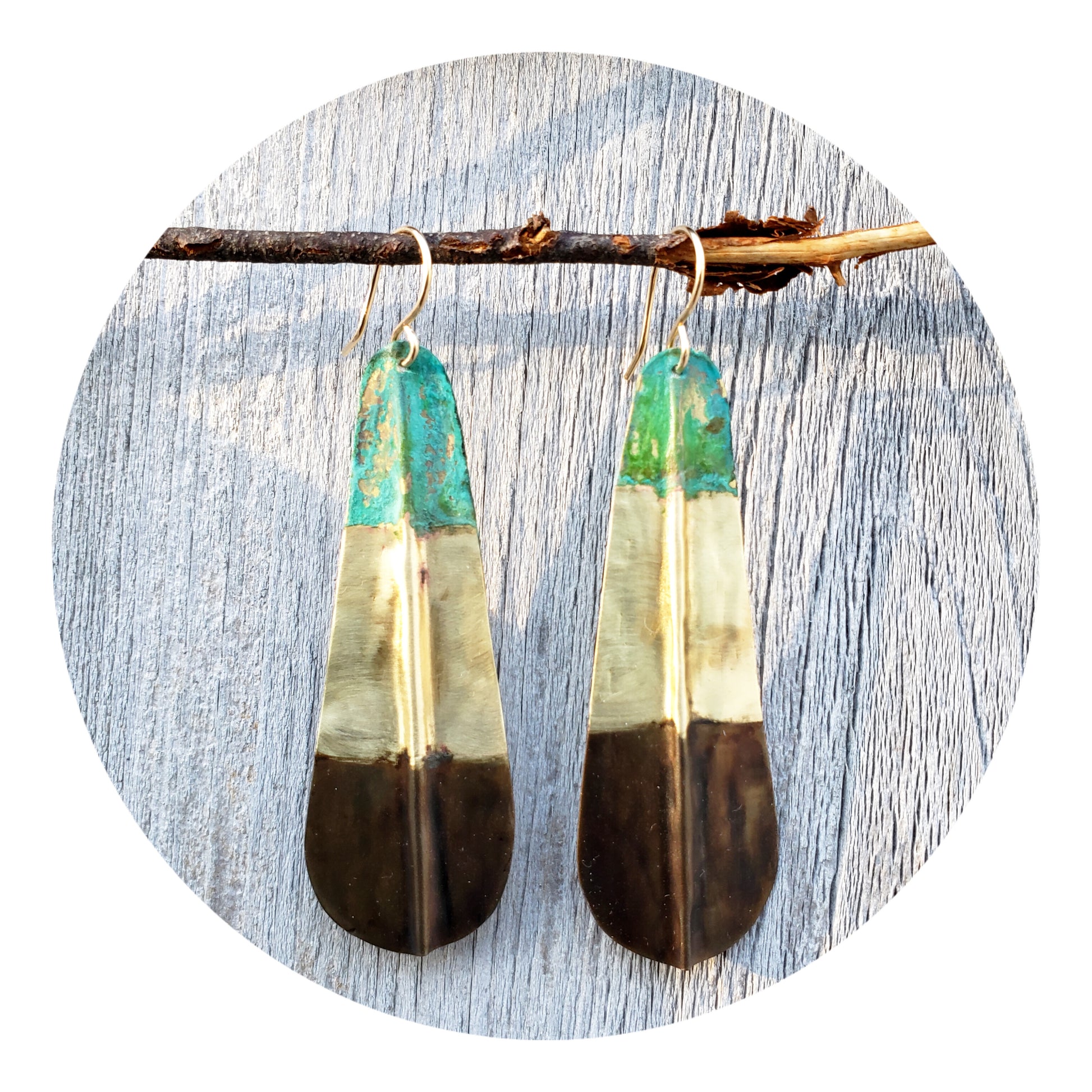 Dive into ocean-inspired style with these handcrafted Ocean Treasure earrings. Each pair features textured brass with a striking green patina and glazed finish that locks in the oxidation for lasting character. Sterling silver ear wires ensure comfort. The warm golden undertones of brass pair beautifully with gold jewelry, making them endlessly versatile. Since every pair is individually crafted, yours will be completely one-of-a-kind. Styles and sizes vary—contact crystalborealisstudio@gmail.com to explore current options and find your perfect match.