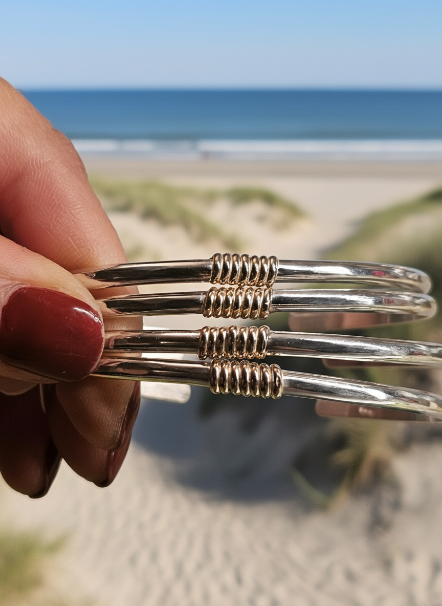 Crafted from hammered sterling silver with a hand-wrapped 12k gold-filled center, this cuff is an easy-to-wear classic. Wear it on its own for a minimalist statement or layer it with your other favorite bracelets for a stacked look. Hammered accents. Available in sizes XS, Small, Medium, and Large.